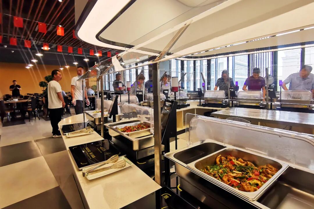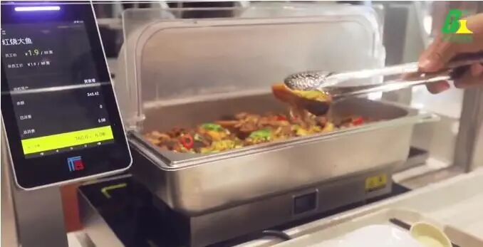 餐廳的每個(gè)菜品都配備了一個(gè)結(jié)算系統(tǒng),把餐盤放在結(jié)算盤上夾菜,智能稱重系統(tǒng)會(huì)根據(jù)重量自動(dòng)計(jì)算價(jià)格,以此類推,餐后15分鐘,系統(tǒng)會(huì)自動(dòng)結(jié)算并實(shí)現(xiàn)無(wú)感支付▼