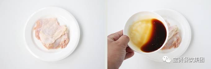 2.琵琶腿去骨后,將調(diào)制好的照燒汁加入腌制20分鐘